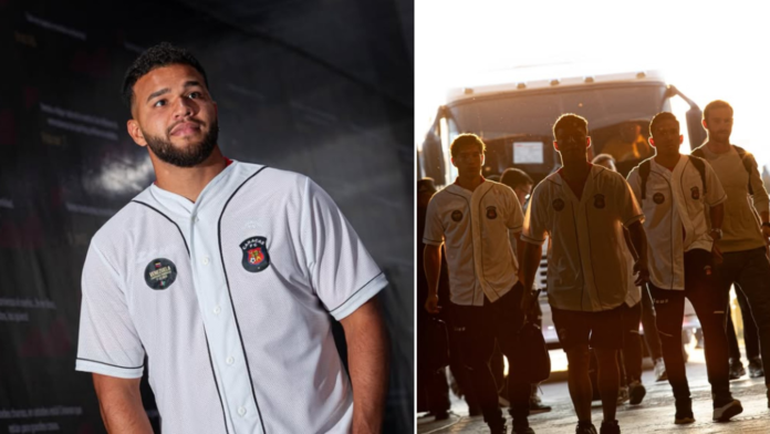 A equipe de futebol também postou fotos na rede social oficial do clube com blusas de baseball num momento pré-jogo.