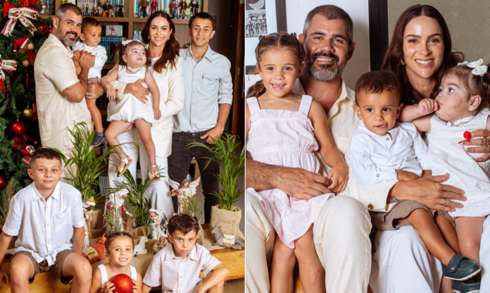 Assim que a porta da casa se abre, Estêvão, de 1 ano e 8 meses, aparece na escada com um sorriso de quem recebe amigos. Maria Madalena, de 4, desce os degraus inquieta mostrando seus dotes artísticos entre movimentos de ginasta. Gaspar, de 6, também surge curioso com tanta gente trazendo equipamentos fotográficos para dentro de sua casa. Outros dois filhos de Juliano e Letícia Cazarré — Vicente, de 15, e Inácio, de 13 — chegam em casa um pouco depois. E Maria Guilhermina, de 3, que até então estava com a cuidadora em seu quarto, se junta aos demais para as fotos deste ensaio da Canal em torno do presépio.