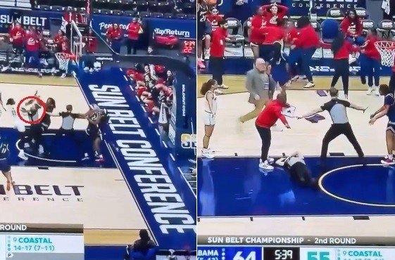 South Alabama e Coastal Carolina jogavam na tarde de quarta-feira (4/3) quando, no último quarto, uma briga explodiu em quadra. Uma árbitra que tentou separar as atletas universitárias envolvidas acabou levando a pior: foi nocauteada durante a troca de socos.