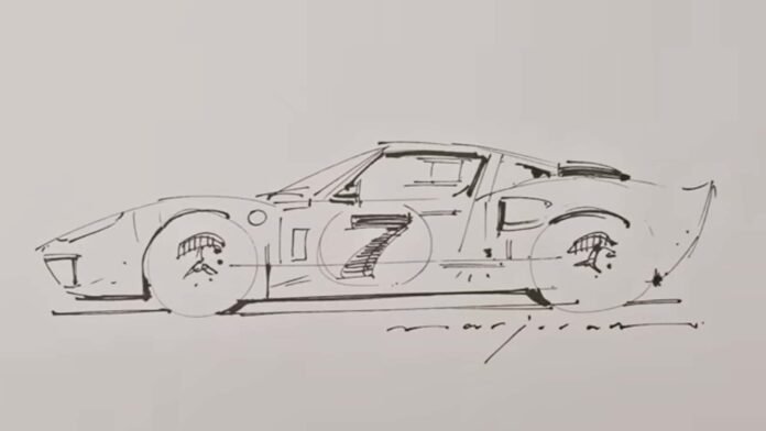 A partir daí, Marjoram rapidamente começa a desenvolver o resto do veículo com sua caneta. O Ford GT40 começa a tomar forma graças às linhas dos pára-lamas dianteiro e traseiro. Em seguida vem o teto baixo e a silhueta icônica aparece diante de você.