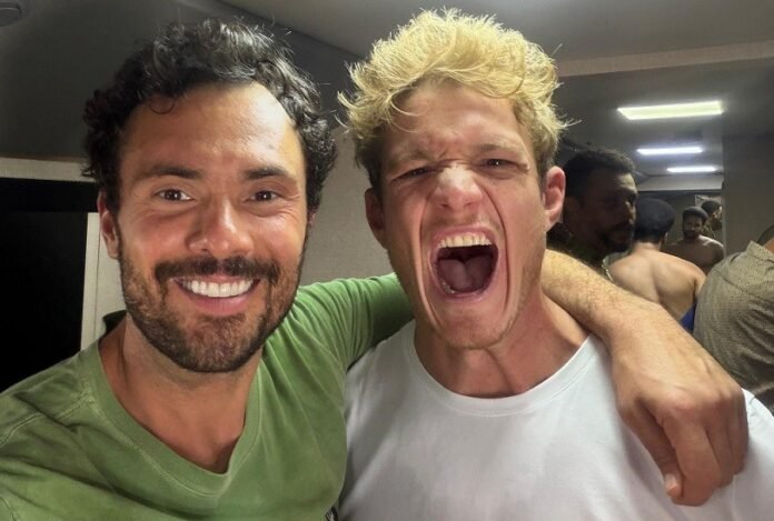 Adriano Toloza e Pedro Novaes posam juntos em clima de descontração nos bastidores das gravações de “Três Graças”, mas, na trama, a história é bem diferente. Seus personagens, Angélico e Leonardo, respectivamente, vão se desentender mais uma vez. Tudo começa quando Viviane (Gabriela Loran) sai da cadeia. A farmacêutica encontra os dois à sua espera, e o clima esquenta quando eles passam a disputar quem terá o direito de levá-la para casa.