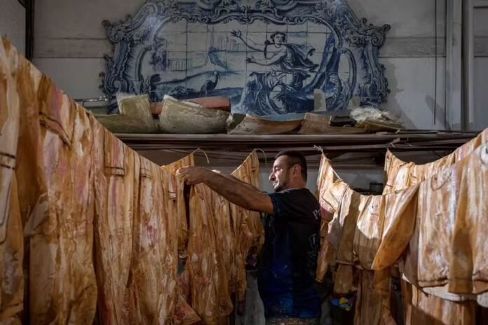 Após deixar o varal, que tem ao fundo um cenário de TV que iria para o lixo e imita azulejos, as peças da Vila Isabel ainda passam por uma nova demão, desta vez para marcar, com tinta preta, detalhes de bolsos e botões, por exemplo, assim como, em uma das golas, colocar várias cores, para relembrar uma paleta (onde pintores colocam as tintas).
