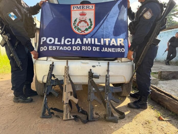 Segundo a Polícia Militar, os quatro fuzis apreendidos se somam aos mais de 135 armamentos desse tipo retirados de circulação no estado desde o início de 2026.