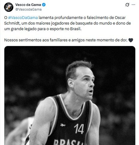 “O #VascoDaGama lamenta profundamente o falecimento de Oscar Schmidt, um dos maiores jogadores de basquete do mundo e dono de um grande legado para o esporte no Brasil. Nossos sentimentos aos familiares e amigos neste momento de dor”, escreveu o clube.