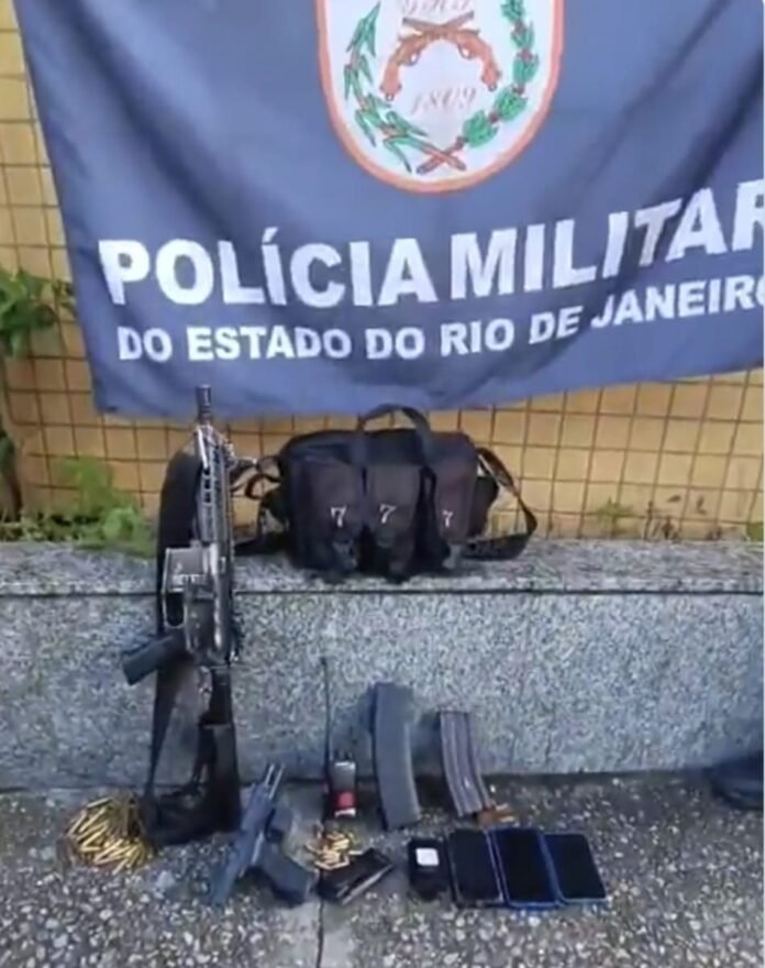 Na ação, os policiais prenderam três suspeitos e apreenderam um fuzil, uma pistola, um rádio comunicador e baterias.