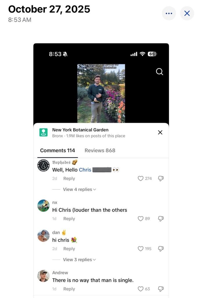Chris Eliott é um horticultor e curador associado do Jardim Botânico de Nova York (EUA). Recentemente, ele apareceu em vídeos nas redes sociais para falar sobre algumas flores presentes no local, como magnólias e cerejeiras, mas o que chamou a atenção de boa parte de quem assistiu aos vídeos foi a aparência do profissional. Em todas as publicações em que aparece, Chris começou a sofrer assédio sexual de diversas pessoas. A situação gerou grande constrangimento, e os comentários foram bloqueados.