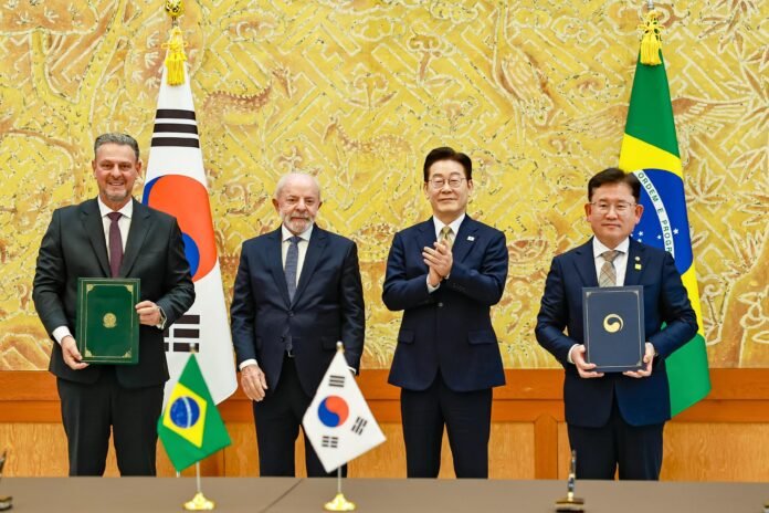 O presidente da Coreia do Sul, Lee Jae Myung, e Luiz Inácio Lula da Silva concordaram com uma série de novos acordos que abrangem áreas como minerais críticos e inteligência artificial, enquanto buscam expandir a cooperação bilateral durante a primeira visita de Estado do líder brasileiro à Coreia do Sul em 21 anos.
