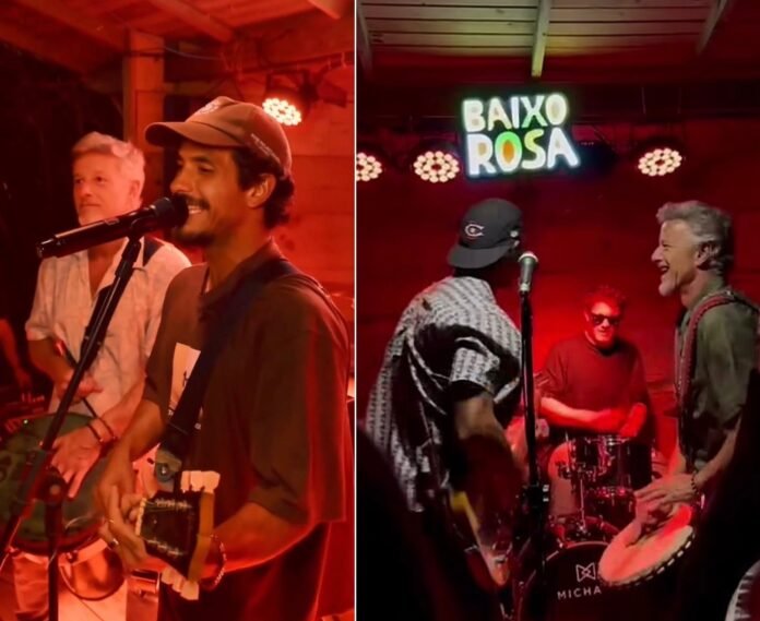 Em família! Marcello Novaes fez uma participação especial na banda dos filhos durante um show no Baixo Rosa, na Praia do Rosa.