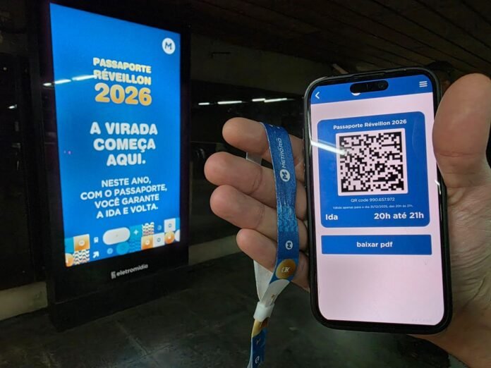No dia 31 de dezembro, a partir das 19 horas, só embarca no metrô quem tiver o Passaporte réveillon 2026. O Passaporte pode ser adquirido pelo site MetrôRio ou pelo aplicativo do metrô. No momento do embarque, será apresentado o QR Code. A pulseira será obrigatória para o retorno. Caso tenha comprado o passaporte, mas só use na volta, será importante pegar de forma antecipada a sua pulseira para o retorno. A pulseira pode ser retirada das 14h às 22 horas na estação Siqueira Campos, Cantagalo, General Osório, Jardim Oceânico ou Maracanã — disse Marcelo Mancini, coordenador de operações especiais do MetrôRio.