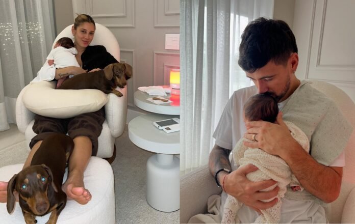 Na poltrona usada para amamentação, sua esposa, Camila Bastiani, se equilibra entre os cuidados com o bebê e a atenção com os outros dois “filhos”, Alfonsina y León, dois cães da raça Dachshund, os famosos salsichas.