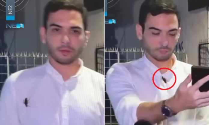 Até uma barata quer 15 segundos de fama na tela da Globo. O repórter Mário Carvalho, de Recife, estava prestes a entrar ao vivo no jornal local quando o animal pousou bem na roupa dele. É possível ver o inseto passeando nas costas, no peitoral e até quase no pescoço, enquanto o jornalista estava concentrado aguardando para passar informações sobre um incêndio.