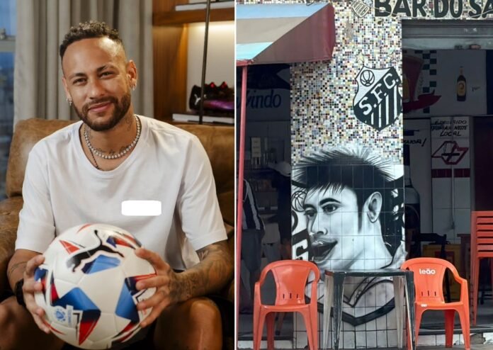 Parece? O jogador Neymar reagiu a uma homenagem feita a ele em um bar em Santos, no litoral paulista, onde joga atualmente: uma caricatura bastante peculiar dele em um pilar do estabelecimento.